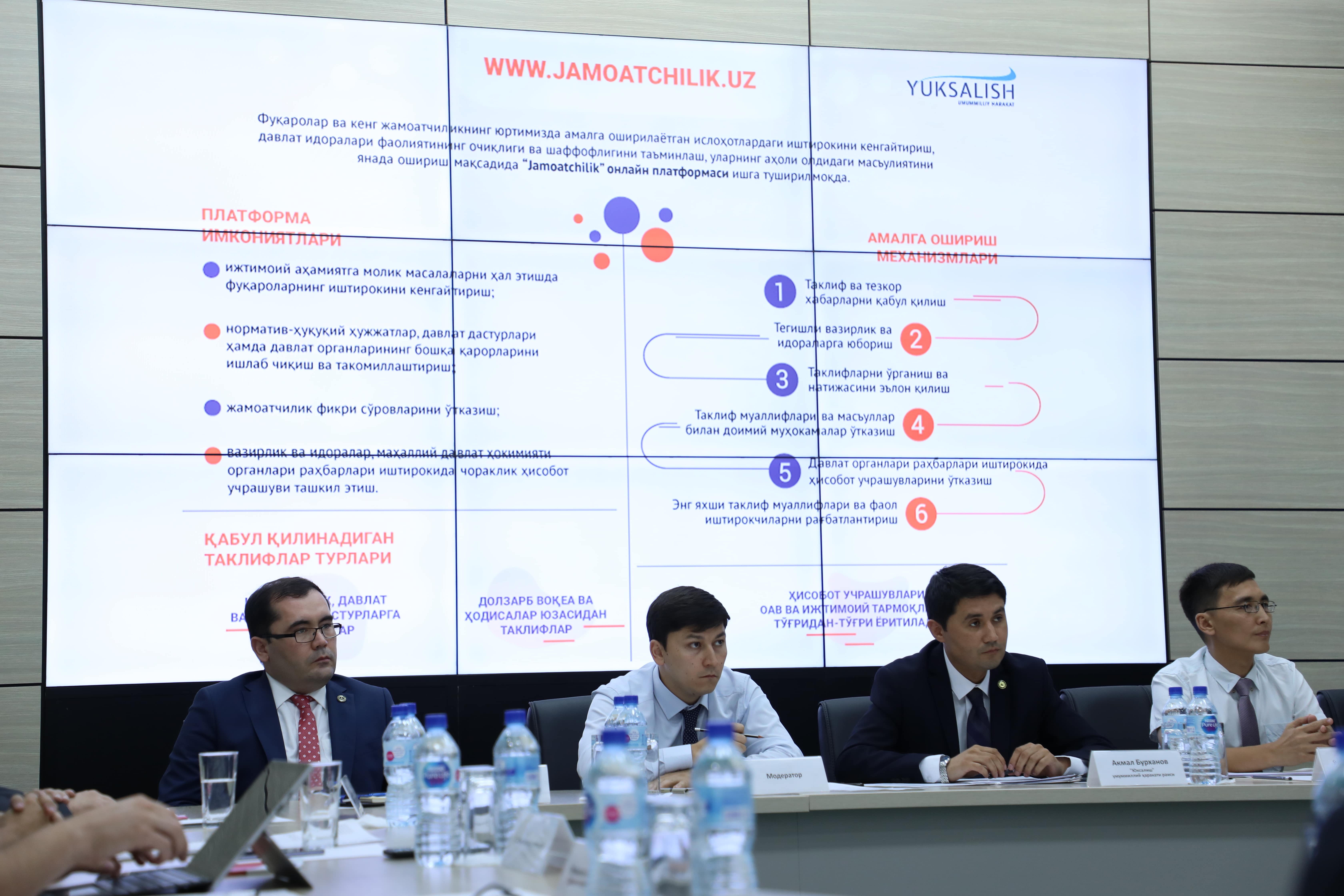 Маълумки, жорий йилнинг 6 август куни “Тараққиёт стратегияси” маркази ва “Юксалиш” умуммиллий ҳаракатининг қўшма лойиҳаси – “jamoatchilik.uz” онлайн платформаси ишга туширилган эди.