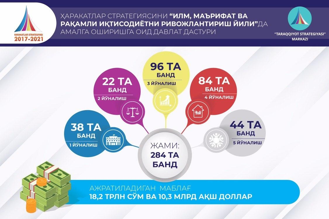 Ушбу дастуриламал ҳужжат 284 та банддан иборат бўлиб, уни амалга ошириш учун 18 171,4 млрд. сўм ва 10 301,5 млн. АҚШ доллари миқдорида маблағ сарфланиши кўзда тутилмоқда. Шундан: